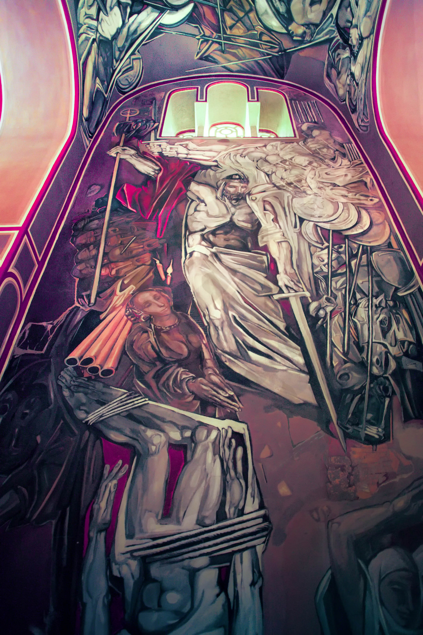 Aided by the toned images through the use of a rosy filter, which gives them a sense of almost exaggerated sweetness, and embellished with clouds that look like cotton candy, these urban landscapes, with no or few people present, make us question what’s behind the long clean boulevards, the great monuments and brand new buildings, the large statues of the always smiling leaders: these are the questions that arise from silent 38E Parallel North.